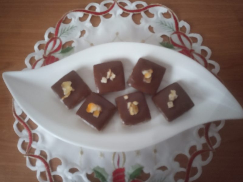 Postup – zpracujeme těsto a vykrájíme čtverečky. Po upečení je slepíme povidly dochucenými rumem. Namáčíme do čokolády a zdobíme kandovaným ovocem.