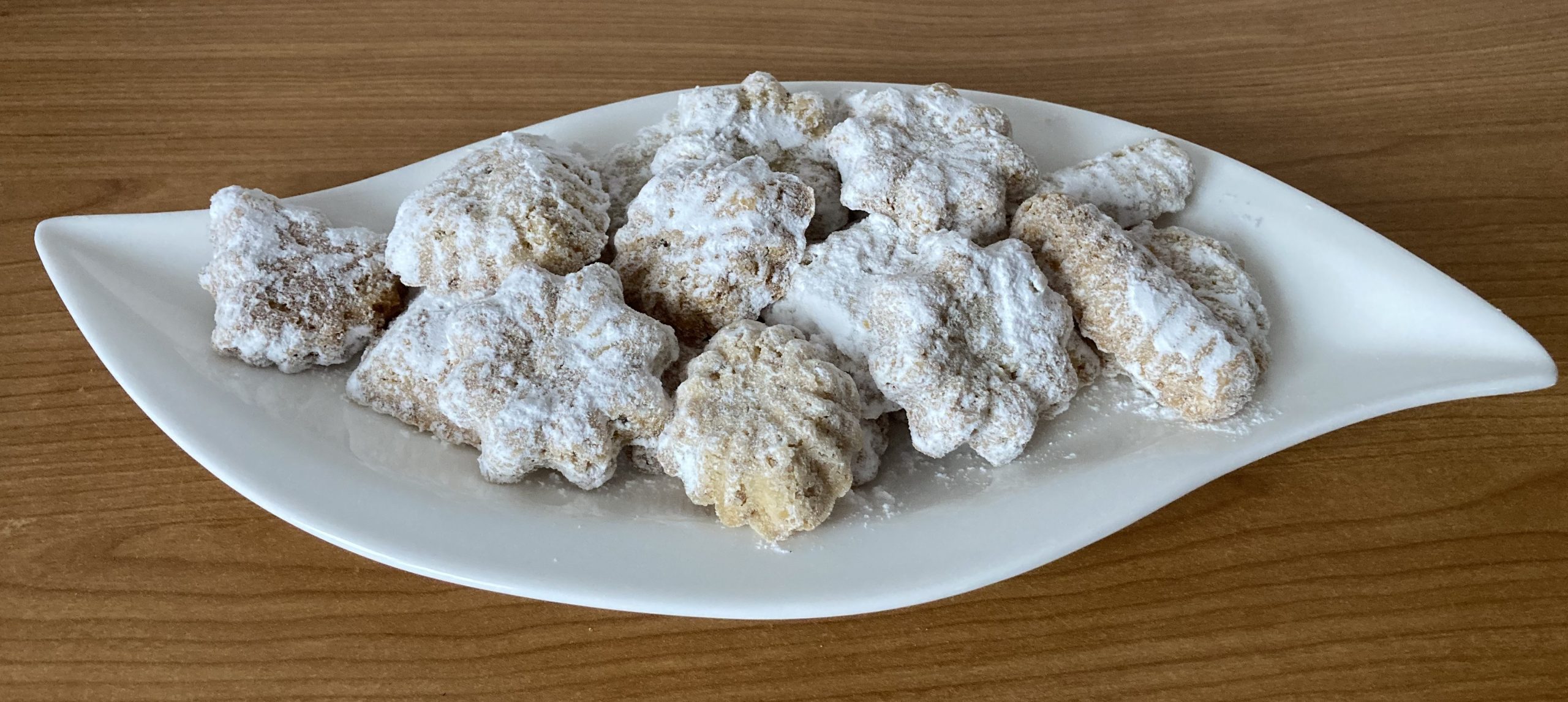 Postup – zpracujeme těsto, po odležení plníme formičky a pečeme. Potom obalíme v moučkovém cukru s vanilkou.
