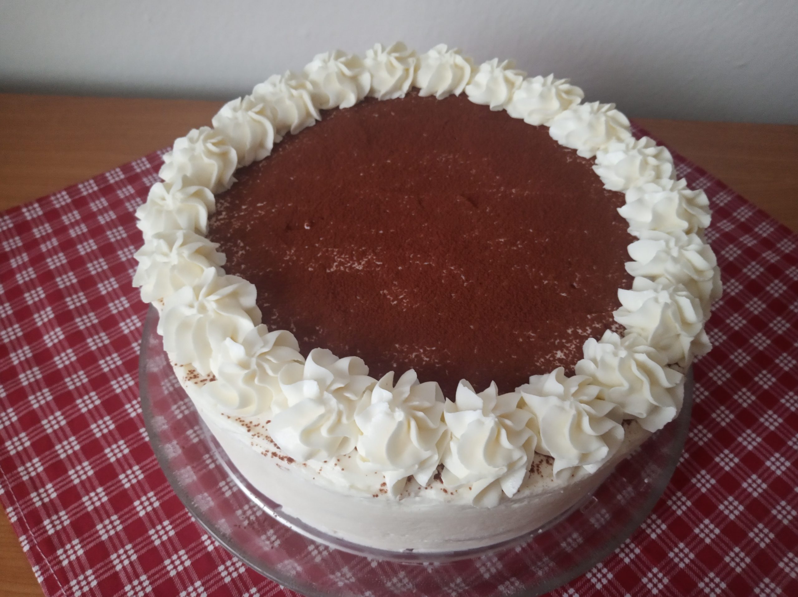 První plát vložíme do dortového ráfku, můžeme ho obtočit dortovou folií, ale není to přímo nutné. Mašlovačkou plát zvlhčíme kávou s likérem a naneseme část krému, nejlépe ustřiženým sáčkem. Další pláty natíráme kávou s likérem po obou stranách a postupně skládáme. Můžeme využít i cukrářské piškoty nebo ty, které jsme upekli ze zbytku těsta. Nakonec celý dort obmažeme po stranách i nahoře a dozdobíme pusinkami. Střed dortu můžeme posypat kakovým práškem.