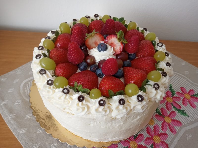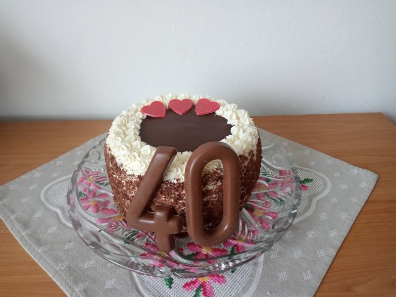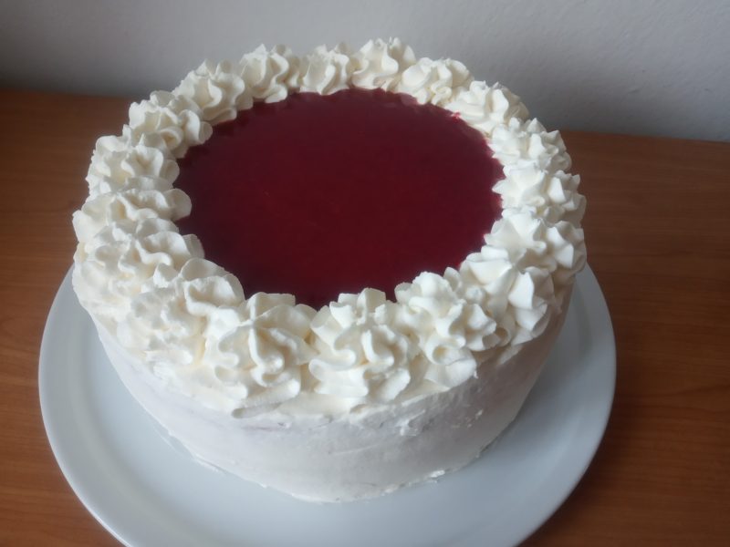 Nyní přijde na řadu malý zbytek upečeného těsta. Rozstrouháme ho a posypeme jím vršek dortu, který jsme předtím potřeli krémem. Nyní už můžeme nechat moučník odpočívat…