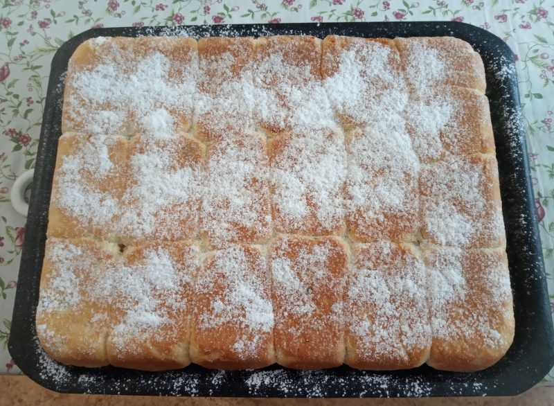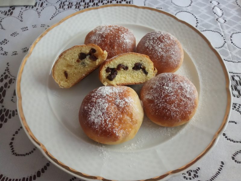 Do mísy vložíme 700 g hladké mouky, půl lžičky soli, 100 g krupicového cukru, 1 vanilkový cukr, citronovou kůru z bio citronů. Asi 300 ml mléka ohřejeme, rozdrobíme do něj kostičku droždí, přidáme lžičku cukru a necháme vykynout. Do 100 ml mléka vlijeme 120 g rozpuštěného másla a rozšleháme 60 g žloutků. Všechno pak smícháme, přidáme podle potřeby mléko nebo mouku, vypracujeme těsto a necháme hodinu kynout. Pak tvoříme buchty, plníme, mašlujeme rozpuštěným máslem, necháme opět kynout v pekáči a upečeme. Potom pekáč přikryjeme stejným pekáčem nebo velkým prkénkem, buchty překlopíme, a následně spodní vrstvu nasáklou máslem, pocukrujeme.