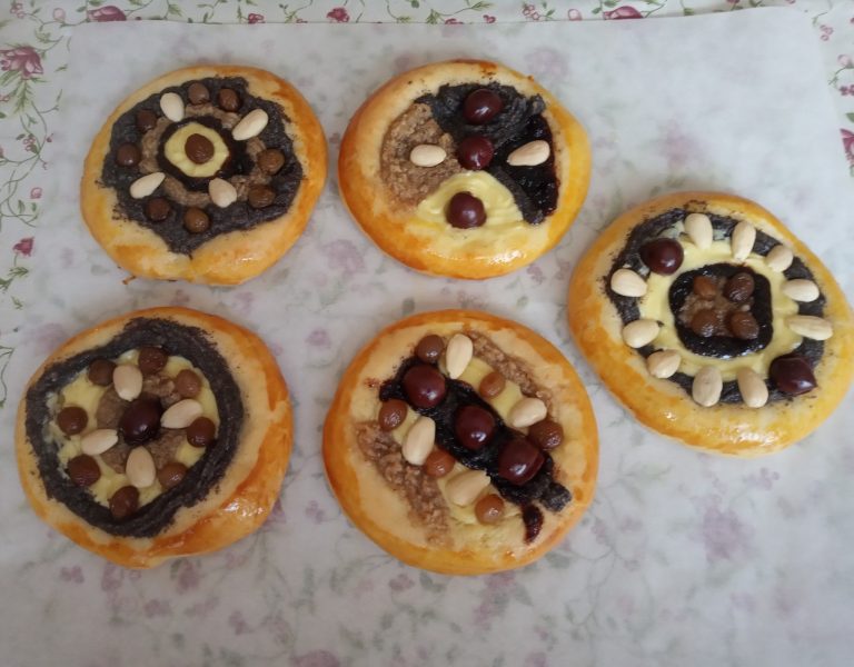 Těsto – 500 g hladké mouky, špetka soli, 1 vanilkový cukr, 100 g cukru, 4 žloutky, 80 g másla, 30 g droždí, citronová kůra