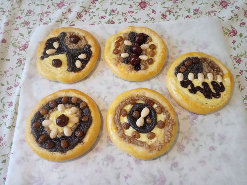 Umícháme kvásek, necháme ho vykynout. Pak smícháme všechny suroviny, vypracujeme běžné kynuté těsto, necháme vykynout. Ze stejně velkých kousků uděláme placičky, naplníme rozinkami, spojíme k sobě a ukoulíme bochánek. Potřeme vejcem, necháme ještě chvíli kynout a upečeme.