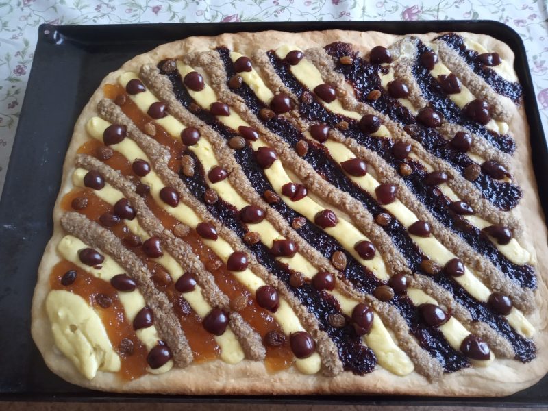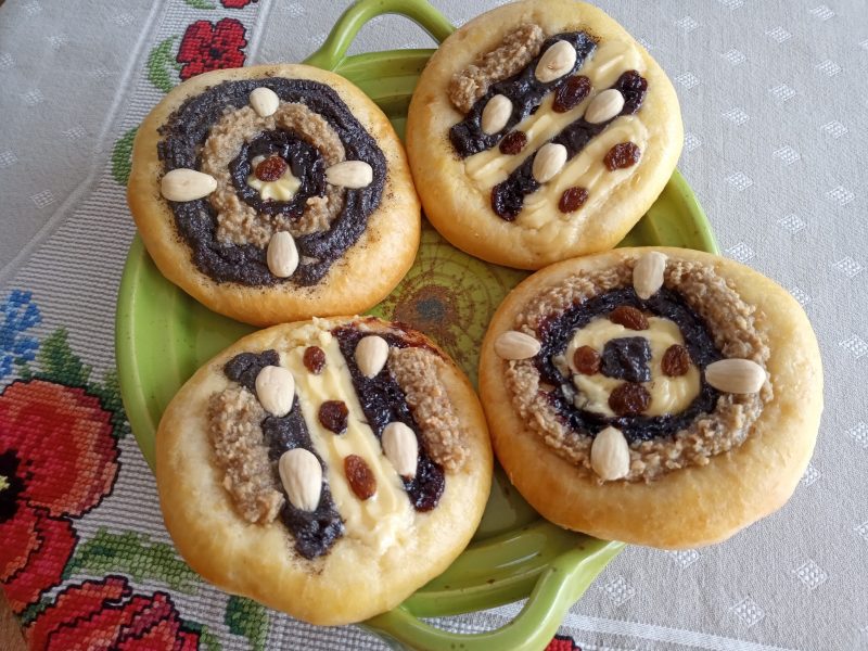 Klasicky zpracujeme kynuté těsto s kváskem, necháme vykynout, vytvarujeme koláče, naplníme, necháme ještě chvíli dokynout a pečeme.