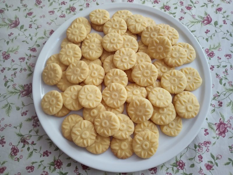 Ušleháme 120 g másla, 50 g moučkového cukru a 2 žloutky. Pak zašleháme 150 g nastrouhaného mandlového marcipánu. Nakonec vmícháme 200 g hladké mouky a špetku soli. Těsto přendáme na vál, lehce propracujeme, rozdělíme na části, z nichž vytvoříme válečky, rozdělíme na stejné části a z nich ukoulíme kuličky. Lehce je zploštíme ozdobnou formičkou nebo válečkem, naskládáme na plech a upečeme. Pečlivě hlídáme, i jedna minuta navíc bude znát. Dívejte se spodní stranu cukroví. Já pekla 11 minut asi při 170 stupních.
